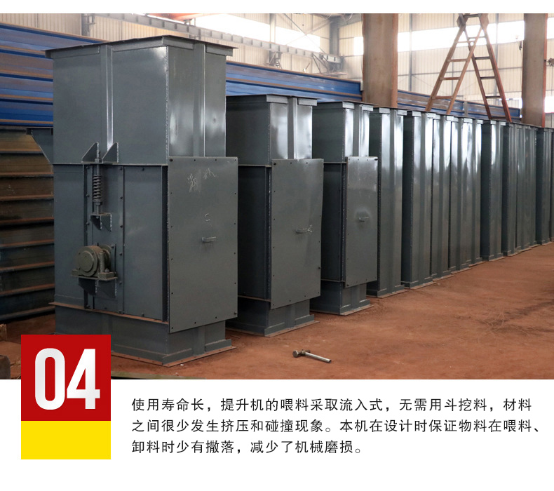 4.使用壽命長,提升機(jī)的喂料采取流入式,無需用斗挖料,材料之間很少發(fā)生擠壓和碰撞現(xiàn)象。本機(jī)在設(shè)計時保證物料在喂料、卸料時少有撒落,減少了機(jī)械磨損。