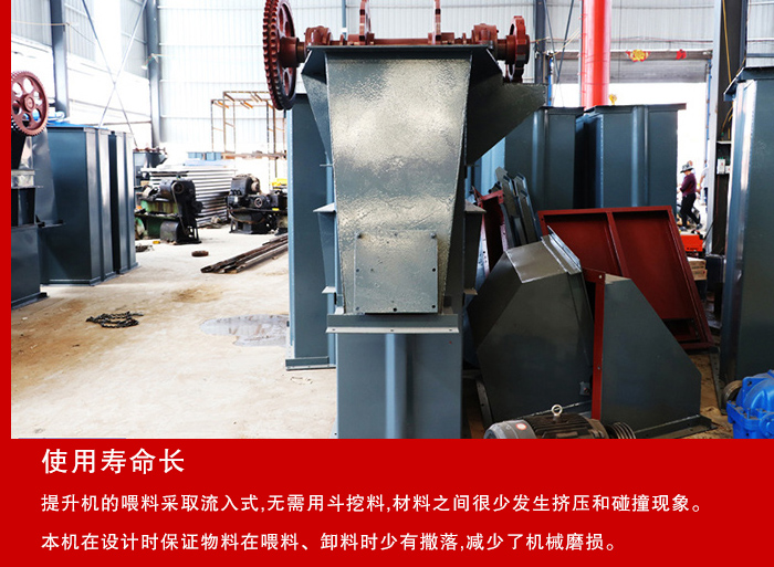 4.使用壽命長;提升機的喂料采取流入式,無需用斗挖料,材料之間很少發(fā)生擠壓和碰撞現(xiàn)象。本機在設計時保證物料在喂料、卸料時少有撒落,減少了機械磨損。