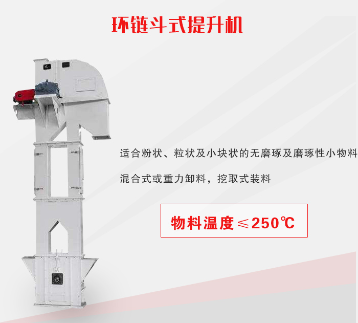 環(huán)鏈斗式提升機適用于垂直輸送磨琢性較大的粉狀、粒狀、及小塊狀物料,如糧食、煤、水泥、碎礦石等,輸送高度高40m,其特點為,結構簡單,運行平穩(wěn),掏取式裝料,混合式或重力卸料,輪緣采用組合鏈輪,更換方便,鏈輪輪緣經特殊處理壽命長,下部如采用重力自動張緊裝置,能保持恒定的張力,避免打滑或脫鏈,同時在料斗遇阻時,有一定的容讓性能夠有效地保護運動部件,物料溫度不超過250℃。