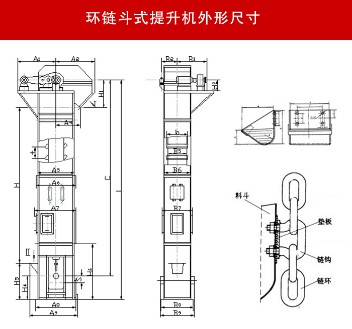 4、鏈條及料斗:鏈條為圓鋼焊接環(huán)鏈,料斗用螺母定在鏈條的接頭上。不同高度的斗提機現(xiàn)套相應數(shù)量的鏈條、接頭、及料斗。