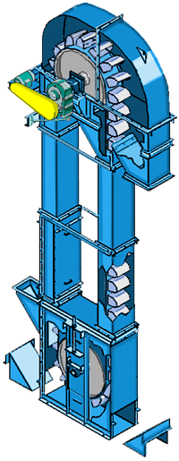 我公司生產的HL型環(huán)鏈離心斗式提升機,由運動部分(料斗與牽引鏈條)、帶有傳動鏈輪的上部區(qū)段、帶有拉緊輪的下部區(qū)段、中間機殼、驅動裝置、逆止制動裝置等組成。本提升機的料斗為間斷式布置,利用“掏取法”進行裝載,“離心投料法”卸料。HL型斗式提升機的牽引機構是兩根環(huán)形鏈條。
