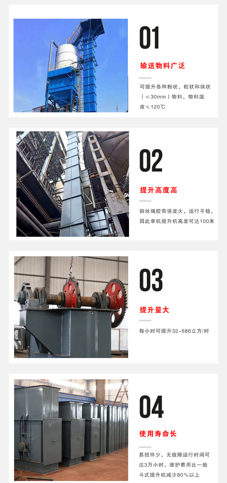 3.提升能力大。膠帶斗式提升機可提升32-686m3/h 。