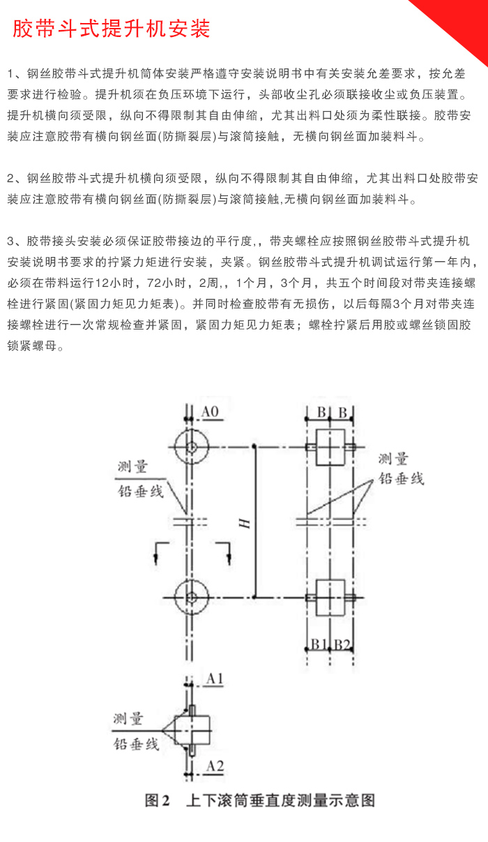 1、鋼絲膠帶斗式提升機筒體安裝嚴格遵守安裝說明書中有關(guān)安裝允差要求,按允差要求進行檢驗。提升機須在負壓環(huán)境下運行,頭部收塵孔必須聯(lián)接收塵或負壓裝置。提升機橫向須受限,縱向不得限制其自由伸縮,尤其出料口處須為柔性聯(lián)接。膠帶安裝應注意膠帶有橫向鋼絲面(防撕裂層)與滾筒接觸,無橫向鋼絲面加裝料斗。
